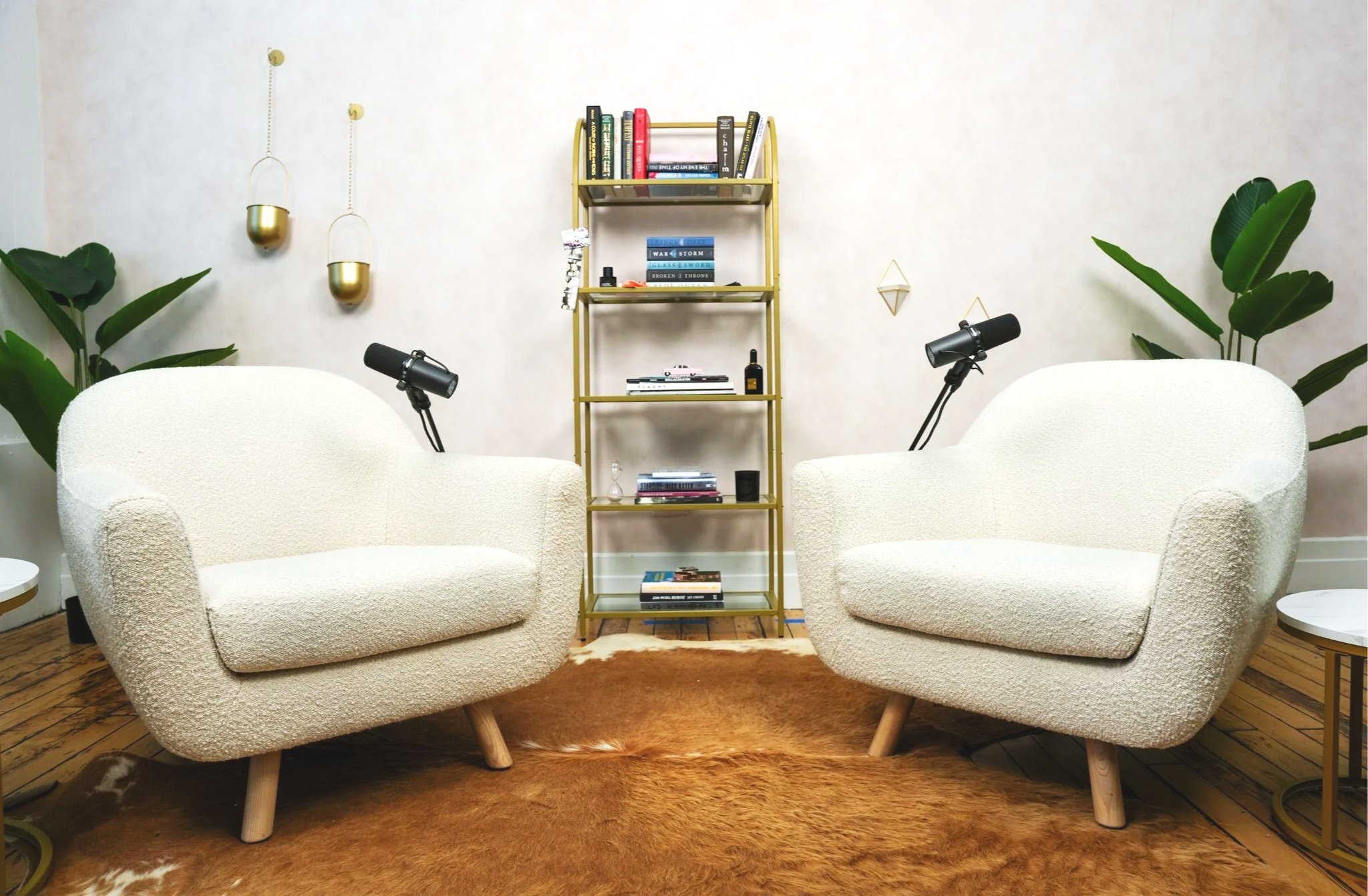 Warm studio lighting, hanging greenery, white boucle furniture with brass legs. Intimate and inviting — the classic WI Studios look. Built for video podcasts and long-form interviews where you want the space to feel like a real conversation.