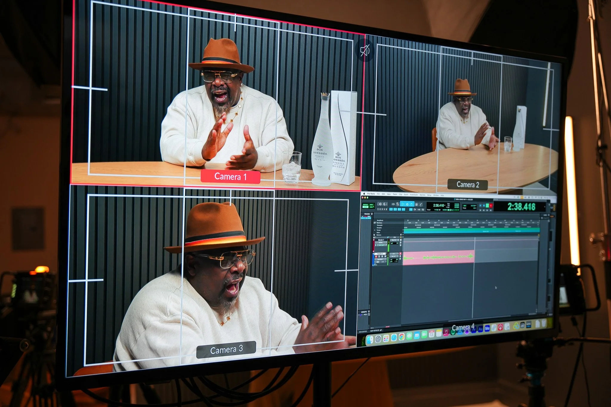 Multicamera 4K production with an on-site engineer. SM7Bs, ATEM switcher, client monitoring, remote recording via Riverside, plus a teleprompter and IFBs. Show up and record.